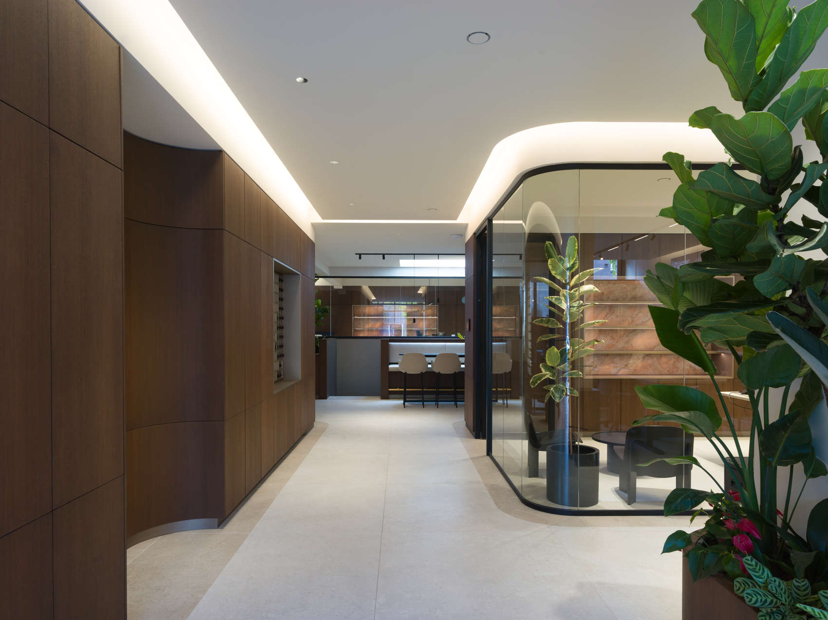 Omdat het diepe pand aan de straatzijde weinig daglicht binnenlaat, is er gekozen voor plafondkoven en indirecte verlichting. Het resultaat: een heldere, sfeervolle omgeving waarin licht de gebruiker door de ruimtes begeleidt. Houten wanden lopen hierin als een vloeiende lijn door het kantoor en verbinden alle functies met elkaar.